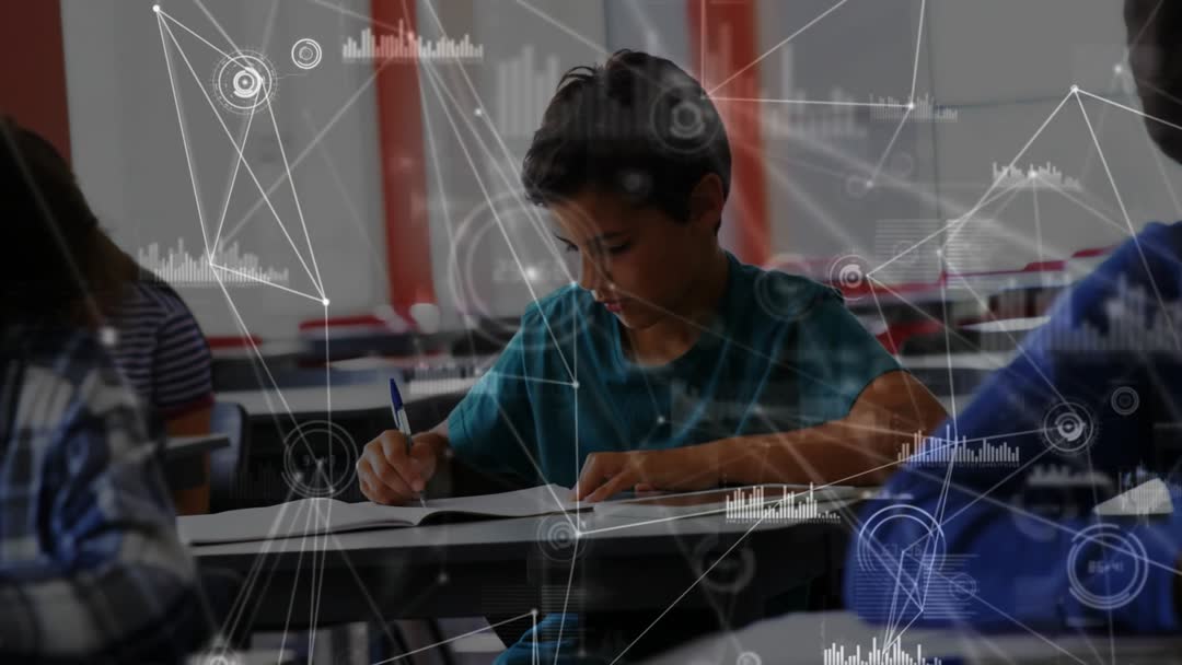 Video frame displays young boy wearing teal shirt focused on writing notes in a classroom. Overlaid digital graphics depict interconnected data and learning tools, symbolizing integration of technology in education. Concept highlights innovative approaches, encouraging collaborative and futuristic learning experiences. Suitable for illustrating technological advancements in learning environments, educational technology resources, and modern teaching concepts.