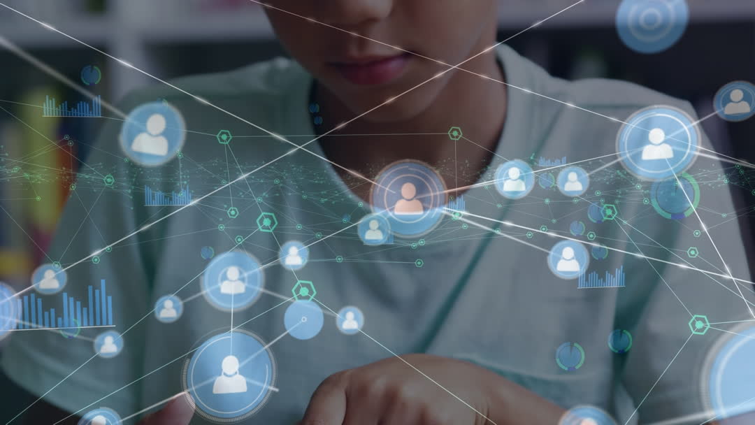 A young biracial boy interacts with a tablet, with an overlay of connecting digital icons representing a technological network. This visual symbolizes education, connectivity, and modern technology, highlighting digital learning environments and global networks. Ideal for educational content, technology advertisements, and articles about digital innovation and global communication.