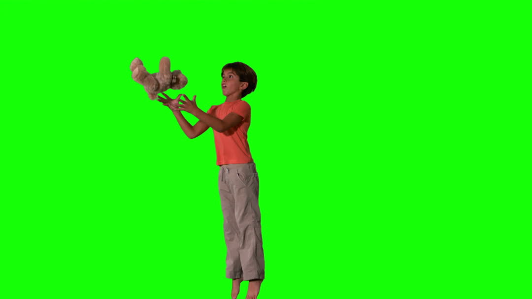 - Boy Jumping to Catch Teddy Bear on Green Screen Background