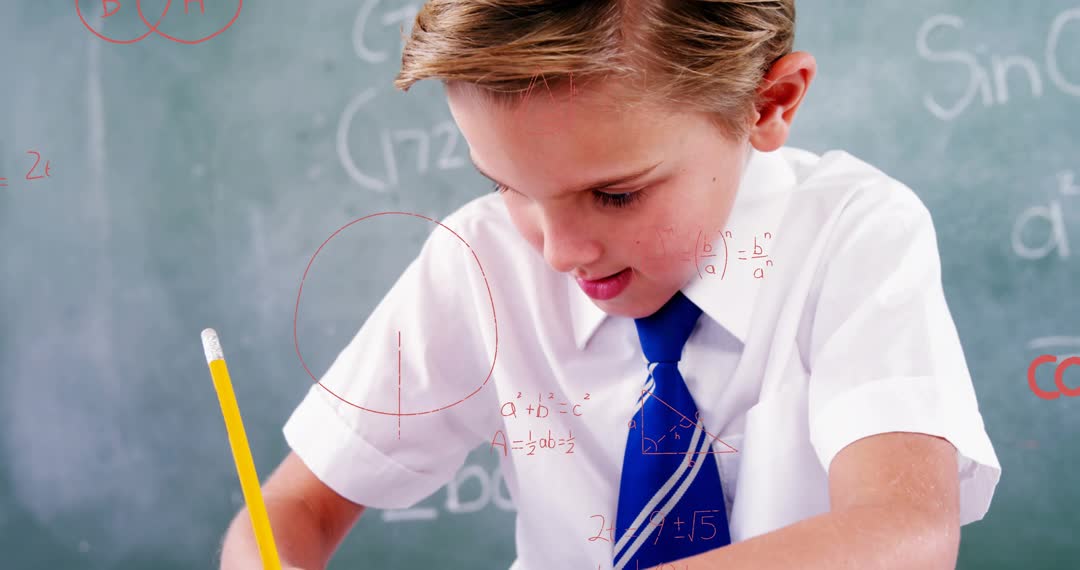 Young boy in classroom intently writing out mathematical equations on desk. Animated geometric shapes emerge, visually illustrating concepts like circles and triangles on chalkboard background. This dynamic scene can be used to promote educational tools, math tutorials, children's learning products, or classroom products focusing on interactive and engaging education. Suitable for educational content related to enhancing learning experiences with animation.