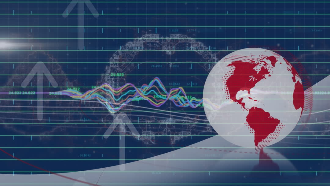 Conceptual illustration depicting interconnected global financial trends with data visualizations. Useful for industry reports, presentations on global data analysis, and exploring themes of economic growth and information technology.