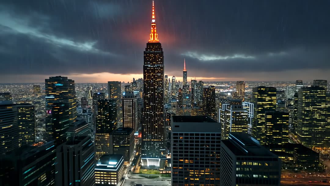 AI Generated Image. A hyperlapse drone sequence highlighting the Empire State Building glowing in midtown New York City at dusk. The video showcases a dynamic aerial perspective with the city skyscrapers lit up against a moody sky, enhancing the urban feel. Ideal for use in projects focusing on city technology, urban architecture visuals, tourism videos promoting New York, or backdrops for discussions on technology and modern city living.
