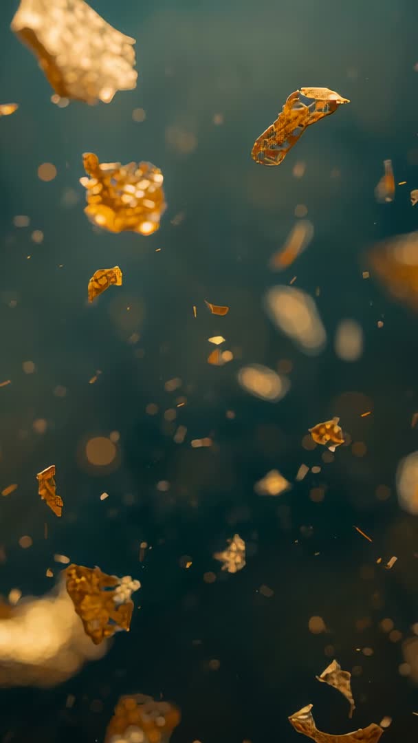 Breeze nudging gold foil fragments falling through deep teal bokeh Video