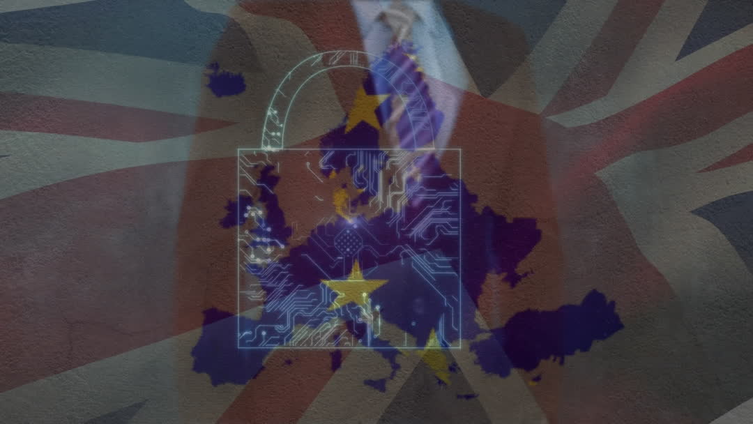 A digital lock overlay set against a backdrop of the UK and EU flags, symbolizing data security challenges related to Brexit and global business. Ideal for use in articles covering Brexit's impact on technology, global finance, or cybersecurity awareness in international markets.