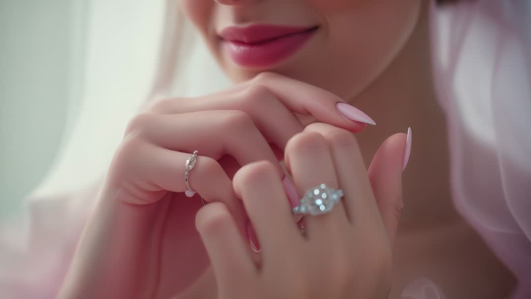 AI Generated Video. Short video clip showing closeup of bride lifting left hand to chin, rotating hand to reveal sparkling diamond engagement ring set on finger. Soft pink veil framing face while lips curve into gentle smile, glossy pink manicure drawing focus to ring. Shallow depth of field and soft cinematic lighting creating romantic, elegant mood. Ideal for jewelry commercial, wedding ad, engagement announcement, bridal blog, social media reel, beauty editorial, product page hero. Suggested uses include slow-motion reveal, overlaying headline text, cutaway shot for wedding film, background for lifestyle article, promotional banner for jeweler.