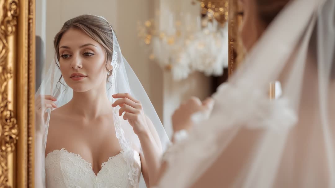 AI Generated Image. Video clip showing bride adjusting veil while checking reflection in ornate gold mirror, smoothing lace bodice and refining hairstyle beneath crystal chandelier. Soft natural light creating warm, elegant mood and shallow depth of field producing cinematic, romantic feel. Composition focusing on close-up reflection and hand gestures, supporting slow-motion and cutaway edits. Suiting wedding highlight reels, bridal salon promos, gown retailer advertising, wedding planning websites, social media reels, makeup and hairstyling tutorials, luxury venue marketing and romantic commercial spots. Serving editorial wedding stories, landing page hero banners, slideshow sequences and product detail cutaways. Color grading friendly and compatible with silent background or ambient music overlays.