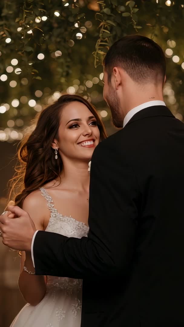 AI Generated Video. Vertical video showing bride and groom dancing under twinkle lights and hanging foliage, capturing intimate first dance moments. Warm bokeh lights and shallow depth of field highlighting smiling bride, gown details, and tuxedo silhouette. Soft camera movement and cinematic color grading creating romantic ambience ideal for mobile viewing. Suitable for wedding videography reels, social media stories, venue promotion, bridal fashion showcases, and romance-themed advertising. Suggested uses: opening shot for wedding highlight film, background for love story montage, hero clip for venue or lighting rental promotion.