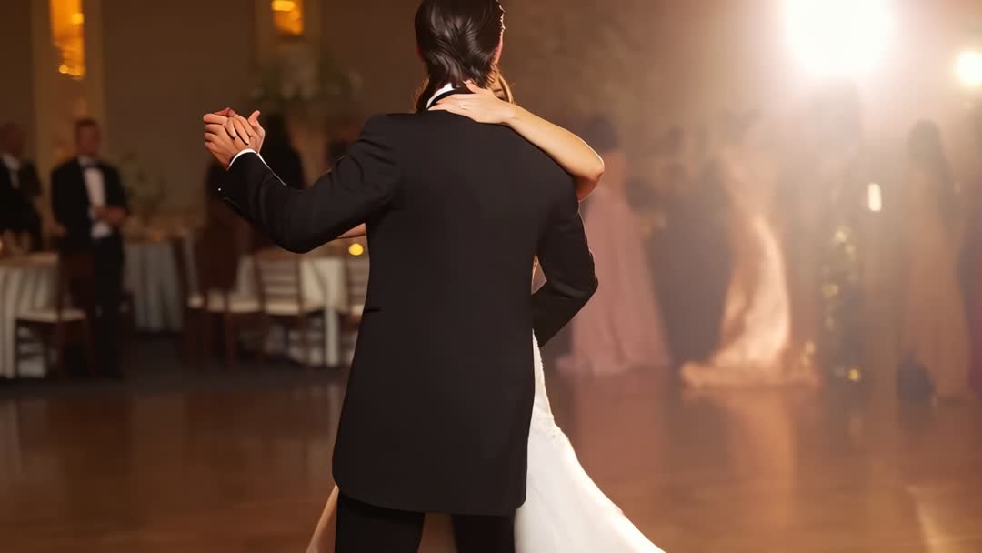 AI Generated Image. Elegant first-dance video showing bride and groom gliding across ballroom floor under warm spotlight. Camera capturing back-of-bride view with flowing gown train and groom in tuxedo, guests softly blurred in background. Soft cinematic lighting creating romantic, timeless mood suitable for wedding highlight reels, invitation videos, venue promotion, bridal blog, romance advertisements, event planning portfolios. Footage working well for slow-motion sequences, background for wedding website hero, social media reels, or promotional trailers for dance instructors and ballroom venues. Editing suggestions: add gentle piano or string score, use gradual dolly or crane moves, include close-up on hands for emotional moments.