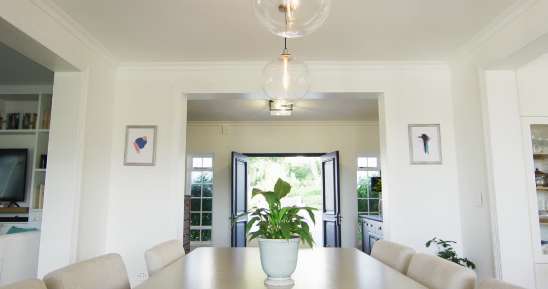 This video showcases a bright and elegant dining room with open doors that lead to a garden, creating a seamless indoor-outdoor experience. A plant in a pot serves as a central decorative element on the dining table, accentuating the room's minimalist and contemporary decor. This serene and inviting domestic space is perfect for interior design inspiration. Useful for real estate promotions, architectural magazines, and home improvement articles.