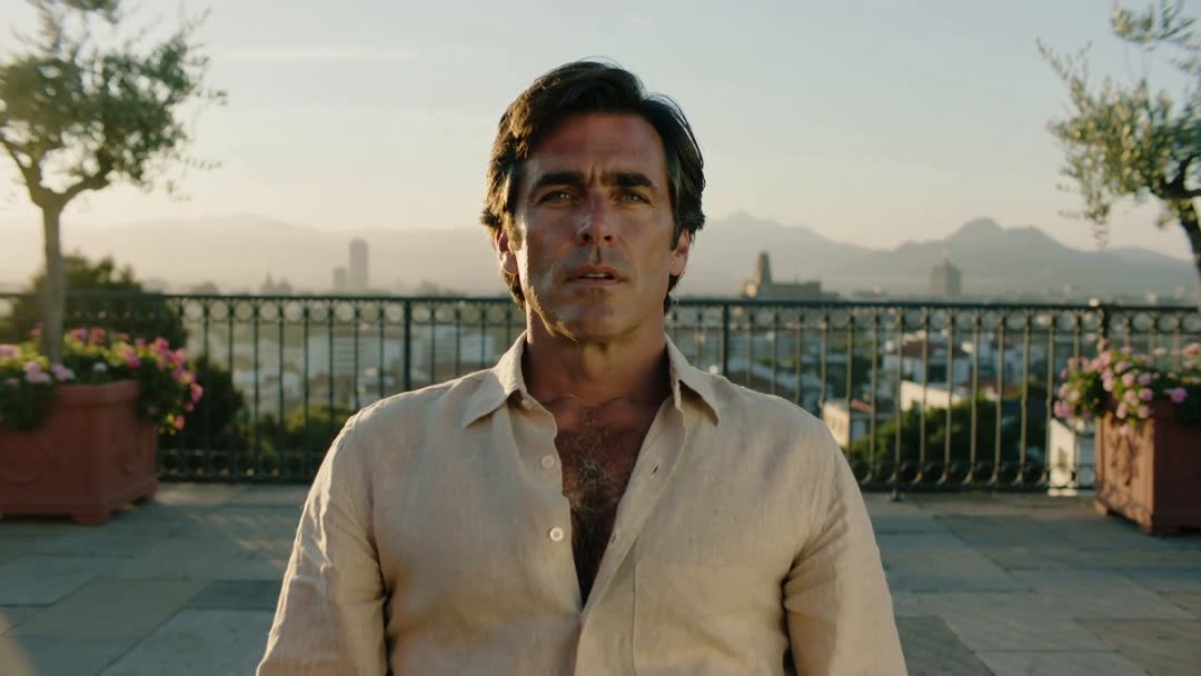 AI Generated Image. Featuring mature man sitting on rooftop terrace, holding steady gaze as camera dollying closer to capture subtle emotion under warm golden hour light. Composed with shallow depth of field and soft backlight, creating cinematic mood and highlighting facial expression while skyline recedes into soft focus. Ideal for commercial use such as travel and lifestyle promos, corporate branding, emotional storytelling, mental health awareness, romantic drama sequences, or actor showreels. Offering slow motion sequences and color-graded options for seamless integration into film, television, online ads, social media content, website hero banners, and editorial projects.