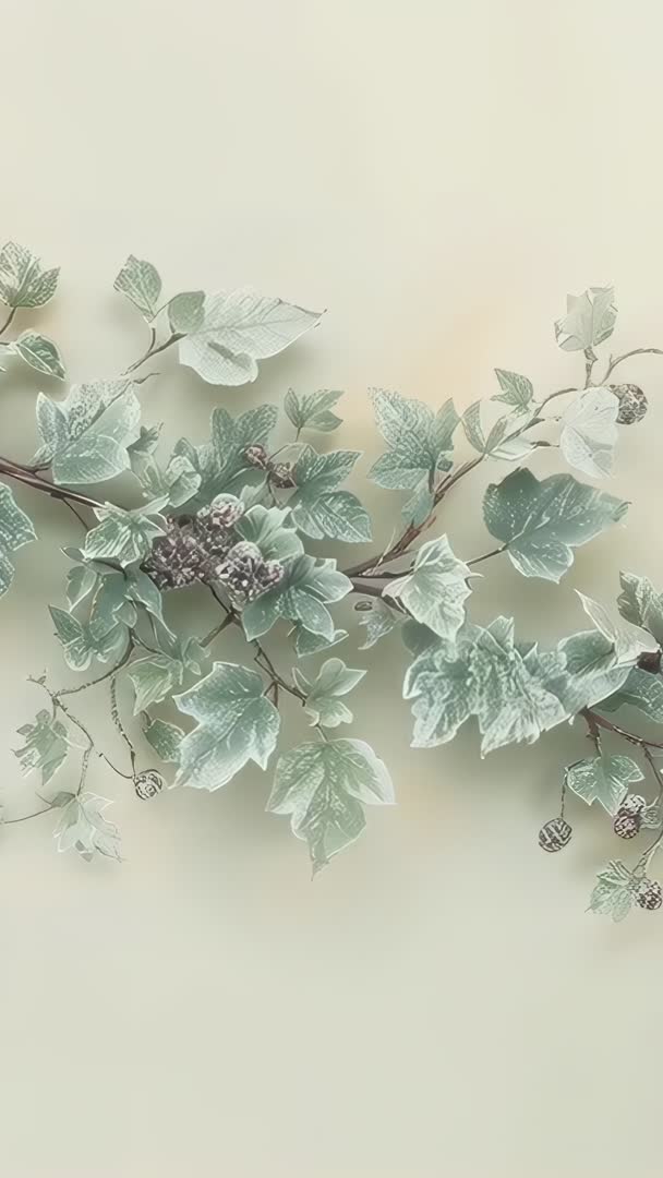 AI Generated Video. Showing brown vine swaying across pale embossed panel with mint green leaves and berry clusters, featuring subtle soft light shift and gentle gradient. Providing calm botanical motion for wellness branding, spa advertising, floral packaging, wedding invitation loops, mobile wallpapers, Instagram stories, and vertical web banners. Featuring vertical 9:16 composition and texture-rich embossed leaves, suiting seamless looping for background video, product overlays, and editorial motion pieces. Evoking organic, elegant atmosphere for social media campaigns, branding reels, interior design presentations, and event opener clips.