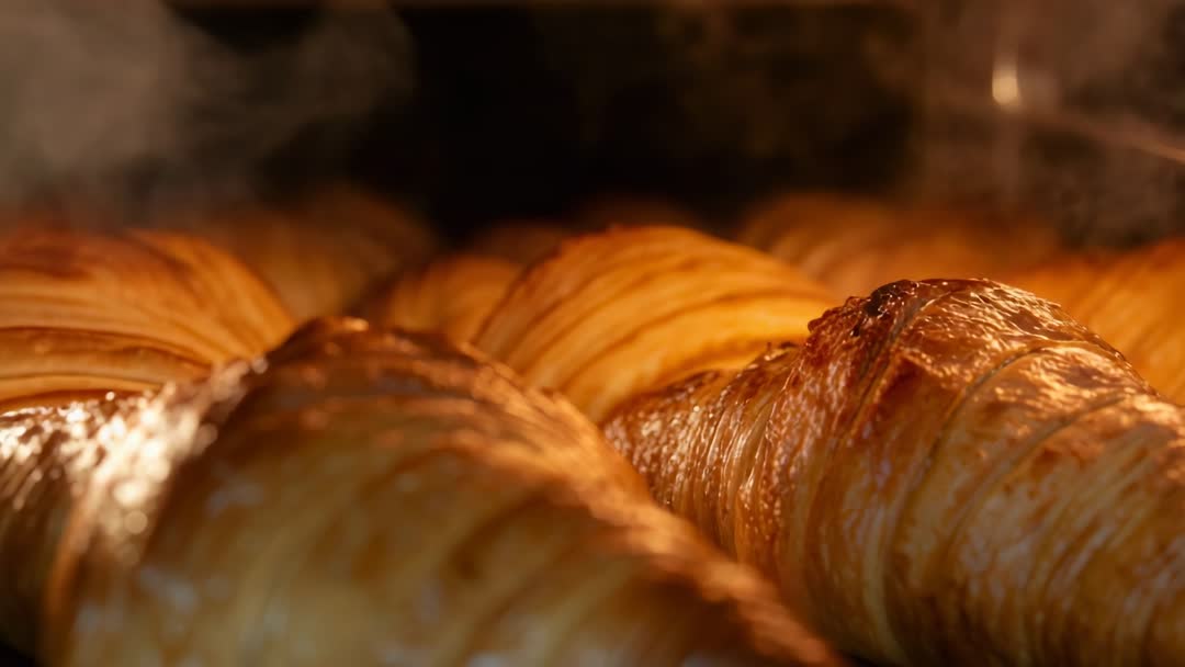 AI Generated Image. Video clip capturing croissants browning and swelling on oven rack, steam rising and crust caramelizing. Closeup focusing on flaky layers, glossy butter sheen, and laminated texture. Warm golden lighting enhancing appetizing color and contrast. Ideal for bakery branding, social media reels, recipe videos, menu display loops, food commercials, packaging animations, website hero banners. Suggested edits: slowing motion for dramatic effect, looping for background ambience, adding close audio of oven ambience and light sizzle, overlaying text for call-to-action, adjusting color grade to boost warmth. Licensing use cases include product promotion, in-store screens, cooking tutorials, cookbook video snippets, culinary training, and advertising campaigns.