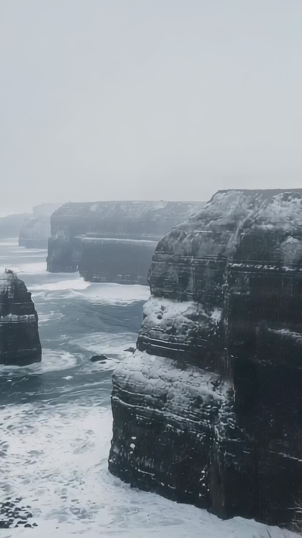 AI Generated Video. Showing rugged snow-dusted cliffs being battered by wind-driven waves, spray and frothy foam. Capturing moody winter coastline atmosphere with low-contrast blue-gray tones and persistent mist. Providing vertical orientation with ample top-area copy space for titles, logos or text overlays. Ideal for use in weather segments, coastal conservation stories, travel promos, outdoor gear advertising, social media vertical reels and cinematic documentary openers. Pairing well with slow cinematic music or ambient sound design; using as establishing shot, transition clip or background loop for immersive web banners and mobile-first campaigns.