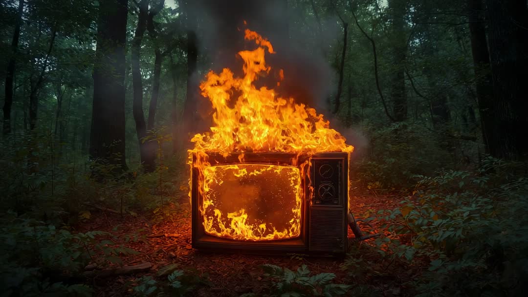 AI Generated Image. The video shows a scene with a vintage CRT television engulfed in bright flames in the middle of a dense forest. The burning device creates a striking contrast between technology and nature, symbolizing themes of destruction and decay. Smoke rises as the embers glow, adding a sense of menace to the atmosphere. This dramatic visual is ideal for concept pieces related to environmental issues, the clash of technology and nature, or the destructive force of media.