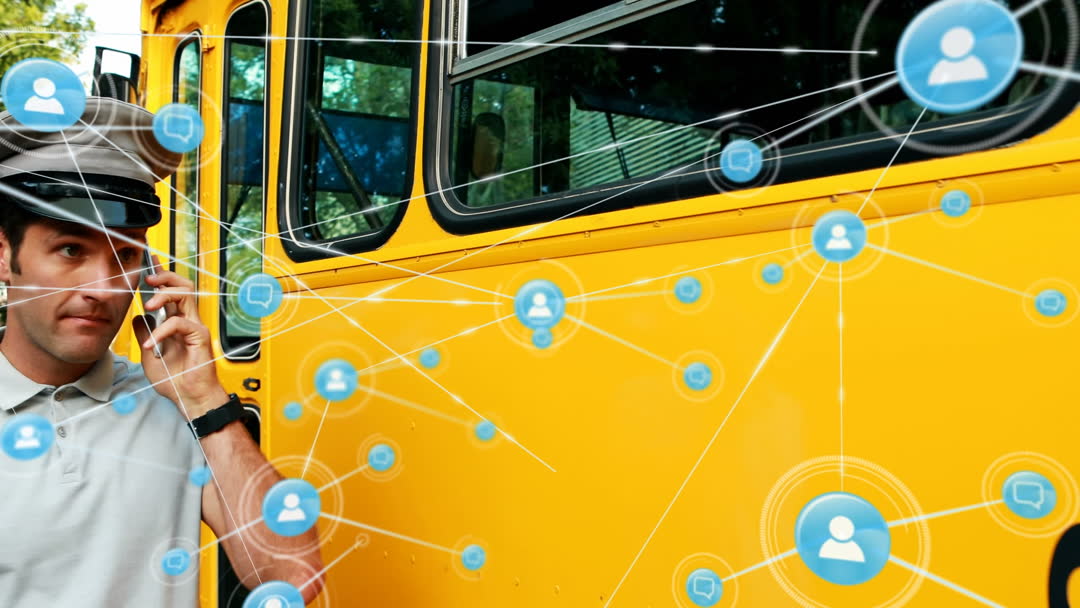 Bus driver in uniform talking on a cellphone while stepping off a yellow school bus is surrounded by digital icons connecting in a network overlay. The video suggests modern telecommunications and the integration of technology in daily duties, emphasizing themes of connectivity and information sharing. Ideal for use in articles or presentations focusing on school transportation innovations, communication technologies, or workforce digital engagement.