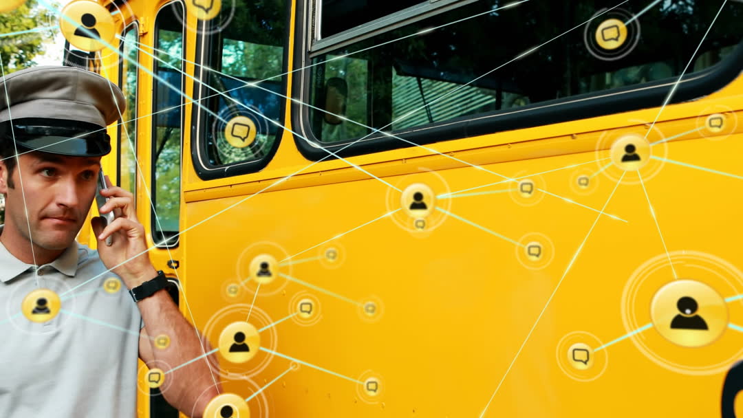 A bus driver processes advanced communication through digital overlays representing a network of connections facilitated by technology. This illustrates the integration of modern tech solutions in transportation for improved logistics and communication. Useful for education on transport technology, communication strategies, and industry future trends.