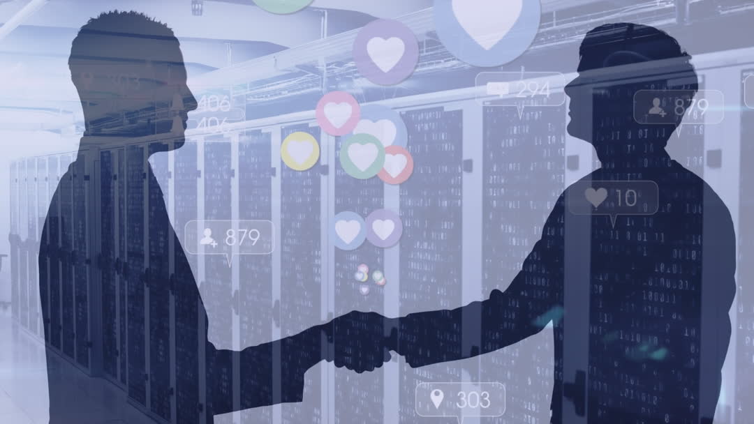 Silhouettes of two businesspeople shaking hands with a digital overlay of social media icons in front of data servers. Symbolizes collaboration in a highly digital and connected environment, perfect for representing partnerships, digital strategy consultations, or marketing campaigns centered around technology and networking.