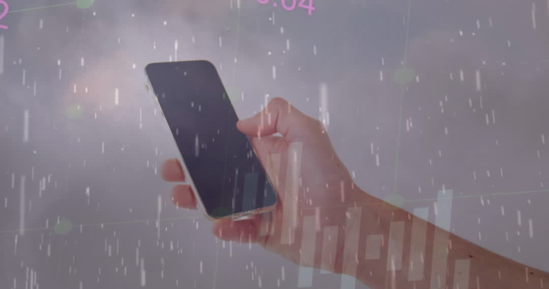 A hand interacts with a smartphone, overlayed with financial data visualizations. This represents concepts of technology in business, digital interface, and the global economy. Suitable for topics on modern investment tools, data-driven decision making, or economic analysis. Can be used in presentations related to finance technology, smartphone apps in business, or stock market studies.