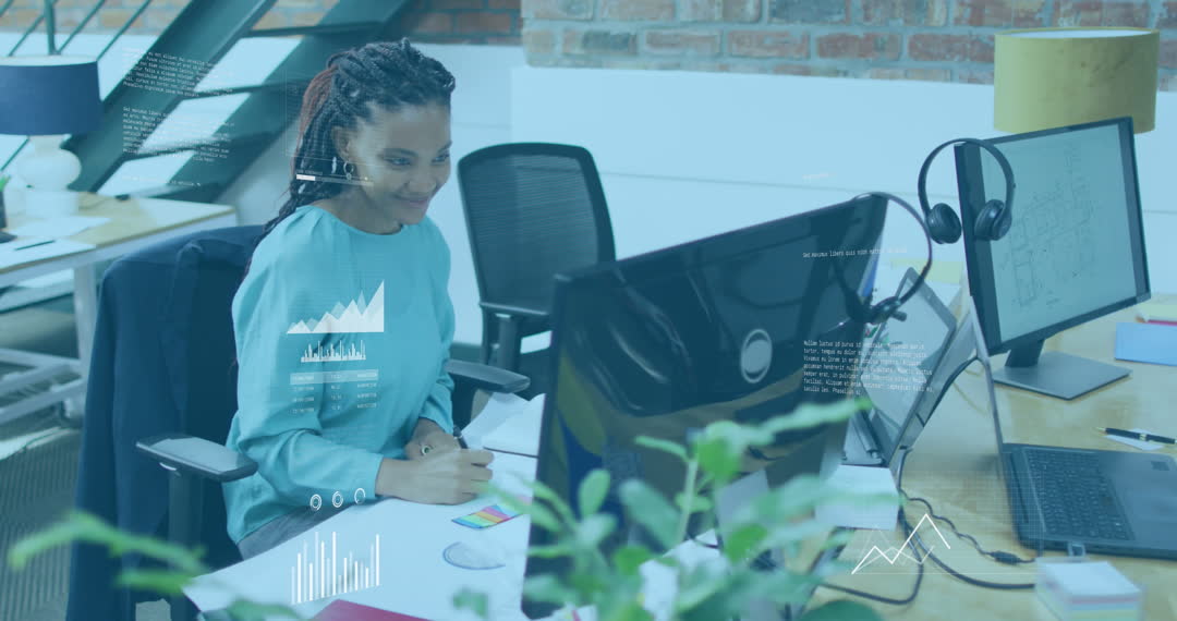 African American woman engaged in data analysis, using computer technology at a modern workspace. Excellent for illustrating concepts related to business analytics, data processing, and office teamwork, as well as diversity and inclusion in technology-oriented professions.