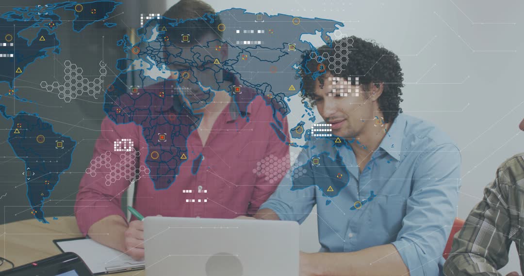 Two men explore data trends with a digital map interface and graphical projections. Suitable for demonstrating data analytics technology, teamwork in a modern workspace, or showcasing collaboration within tech-focused environments.