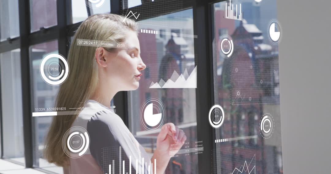 A professional caucasian woman is thoughtfully looking at a window where various digital charts and graphs are displayed. These visuals represent analytics and business growth strategies, hinting at a high-tech, data-driven environment. Suitable for illustrating concepts related to data analysis, technology innovation in business, and corporate strategic planning.