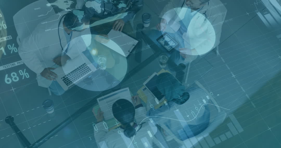 Overhead view of diverse professionals collaborating in a modern office space, overlaid with dynamic data graphics and charts. Suitable for illustrating teamwork, business strategy sessions, and data-driven decision-making. Useful in marketing campaigns emphasizing team-oriented environments and innovative business solutions.