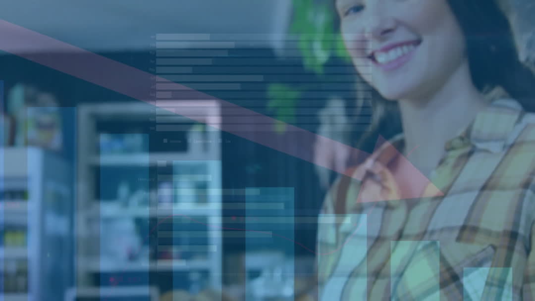 Visualization combines data processing analytics graphs with woman using smartphone in shop environment, illustrating modern technological integration in daily life. Suitable for use in illustrating concepts of business intelligence, data analytics, and ecommerce technology advancements.
