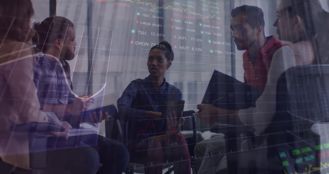A group of diverse professionals are gathered in a modern office setting, deeply engaged in collaborative discussion. They appear to be focusing on business analytics data, displayed through graphic overlays. This video captures themes of teamwork, innovation, data-driven decision making, and modern business strategies. Suitable for use in business and tech articles, projects on workplace collaboration, or presentations on modern analytics trends.