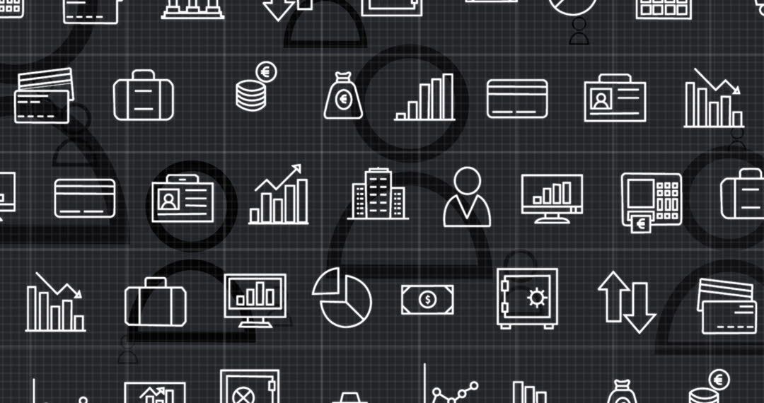 This illustration features a grid of white business and finance symbols over a digital background. Compatible for use in creating corporate presentations, financial technology projects, or websites focused on business solutions and services.