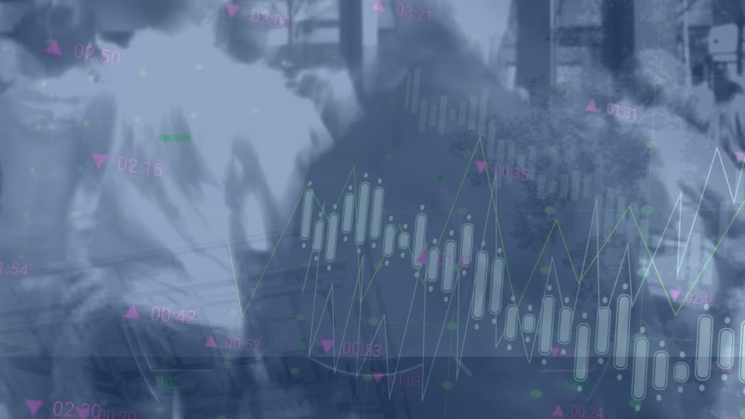Animation shows an overlay of financial fluctuation charts superimposed on a bustling city street, highlighting concepts of global business and data processing. Suitable for illustrating economic analysis, financial marketing, or modern business technologies in urban settings.