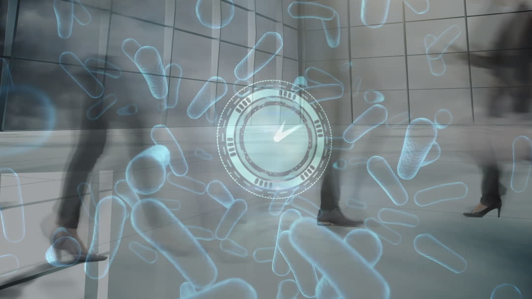 This creatively designed graphic integrates animation of bacteria cells with business people walking beneath a transparent clock to illustrate the impact of time management and health concerns in a business environment. Suitable for use in presentations or publications related to global business strategies during healthcare crises, digital innovations in health, or the impact of pandemics on corporate sectors.
