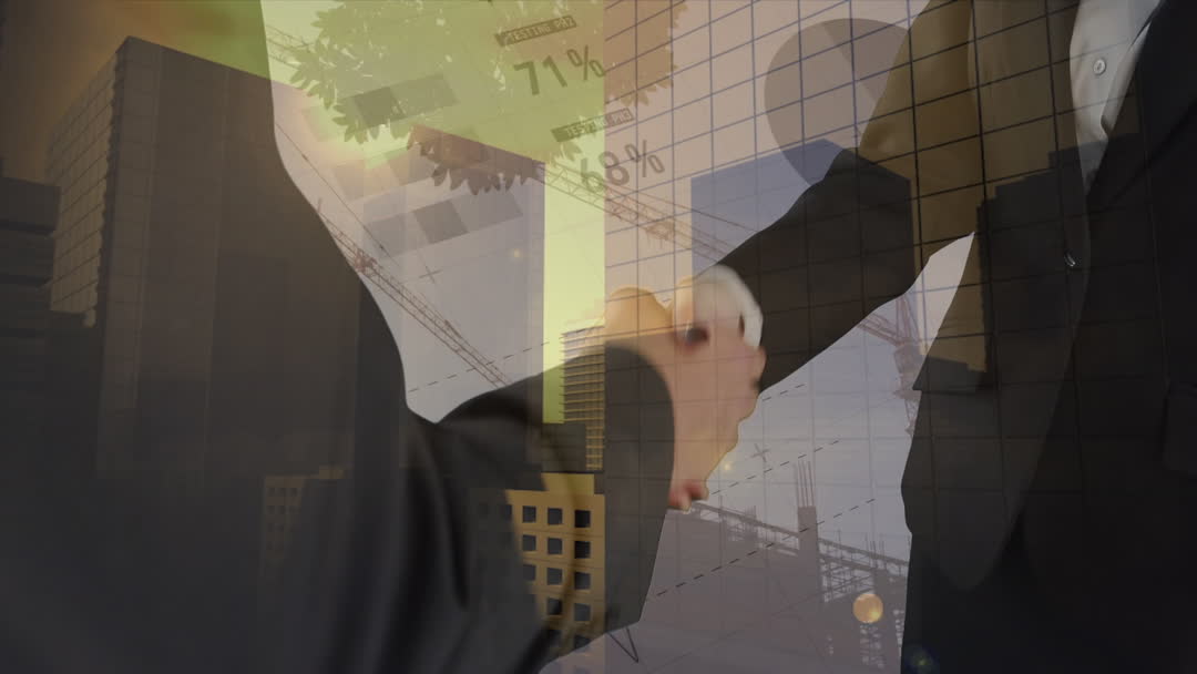 Animation depicting businesspeople shaking hands symbolizing partnership and cooperation. Overlapping cityscape emphasizes urban development and growth potential. Ideal for illustrating themes of business cooperation, economic development, and innovative ventures in urban planning contexts. Useful for presentations, websites, or advertising related to business partnerships and city projects.