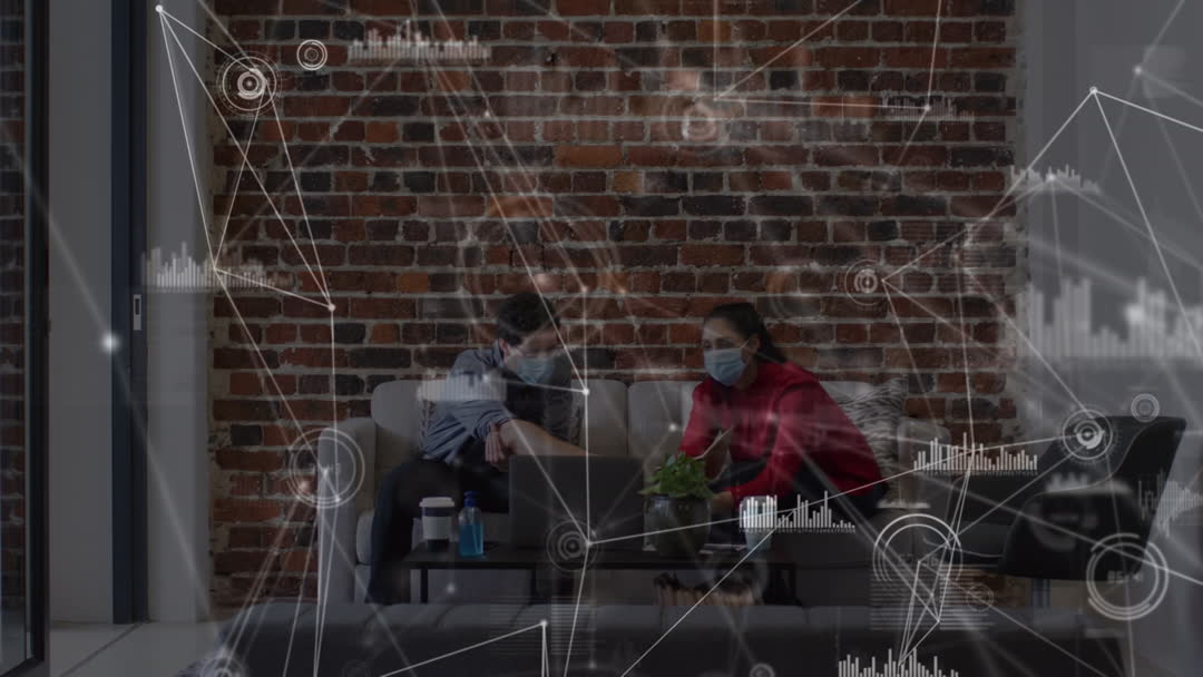Coworkers are sitting on a sofa wearing face masks, collaborating over a laptop. Digital interface overlay displays data and connectivity, indicating the use of technology in remote business duties during the COVID-19 pandemic. Suitable for themes of virtual teamwork, pandemic response in offices, remote working technologies, or data communication advancement. Practical for publications or articles on COVID-19 workplace adaptations or futuristic business technologies.