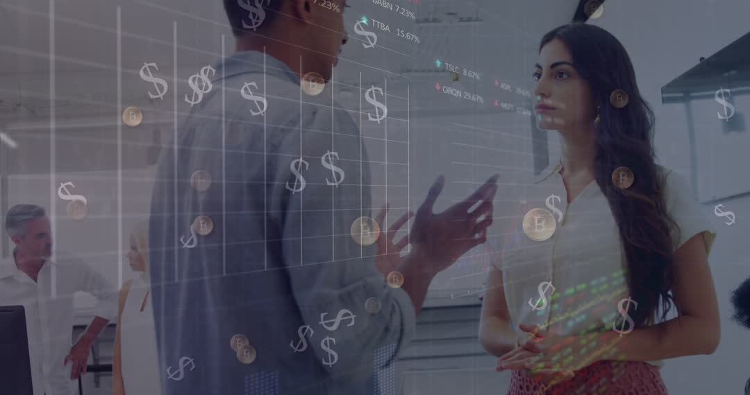 Shows diverse business professionals in conversation, featuring superimposed digital currency and financial graphs. Great for illustrating modern financial environments, communication in business, and technology integration.