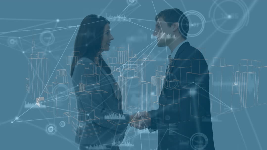 Two professionals shaking hands overlaid with technology symbols and 3D cityscape illustrates modern business collaboration centered on innovation and architecture. Useful in discussing partnerships in technology and urban projects, highlighting interactions within digital transformations, networking and planning.