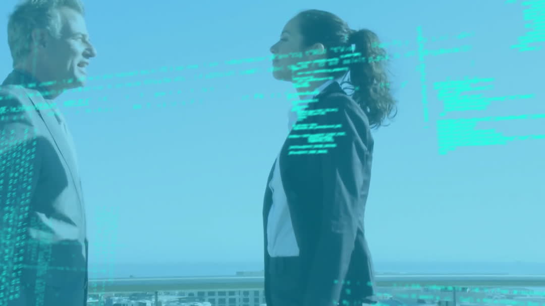 Image depicts two business professionals engaging in a handshake, symbolizing collaboration. The overlay of digital data graphics represents technology and data processing, making it ideal for marketing materials related to global business, innovation, digital transformation, IT services, and networking events.