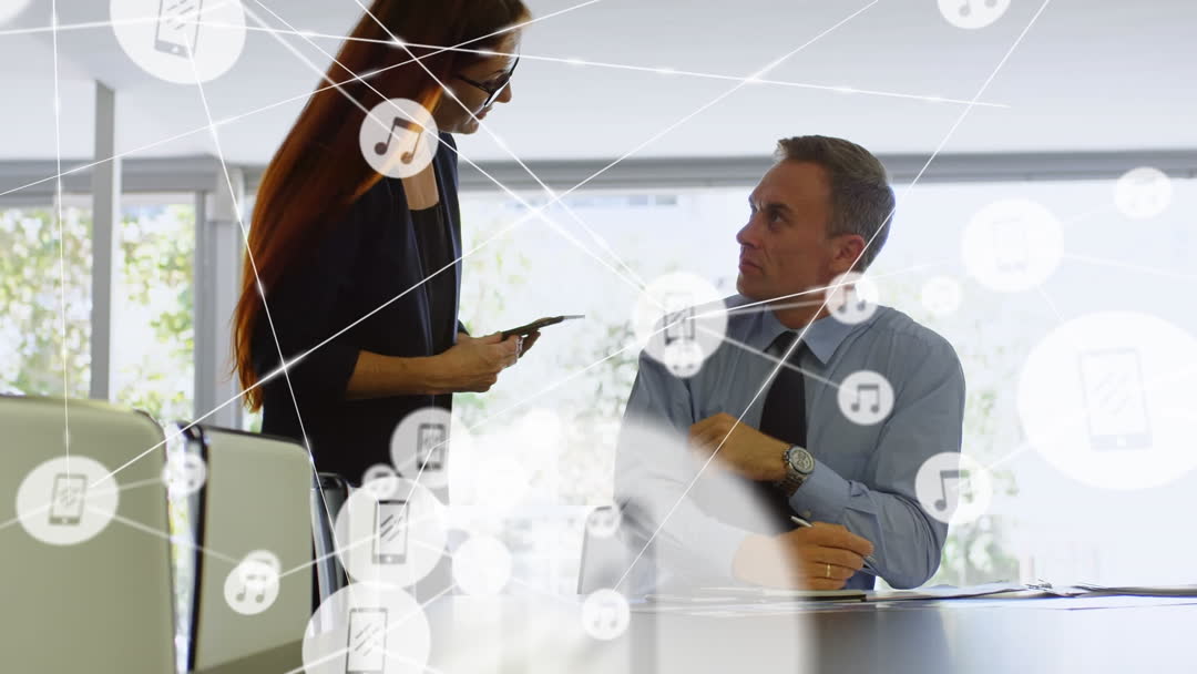 Two business professionals are engaged in a discussion in a bright office environment, interacting amidst animated digital network icons overlay. The video portrays the modern workspace, emphasizing advanced technology and global connectivity. It illustrates a dynamic corporate setting and can be used in articles or presentations focusing on technological adoption in business, team collaboration, or communication strategies.