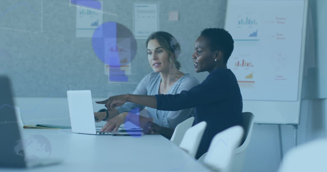 Colleagues focus on laptops discussing data analysis in modern office. Digital graphs in the atmosphere conceptually bridge technology and data-driven decisions. Excellent for showcasing teamwork, consulting services, data analytics tools, or corporate environment depictions.