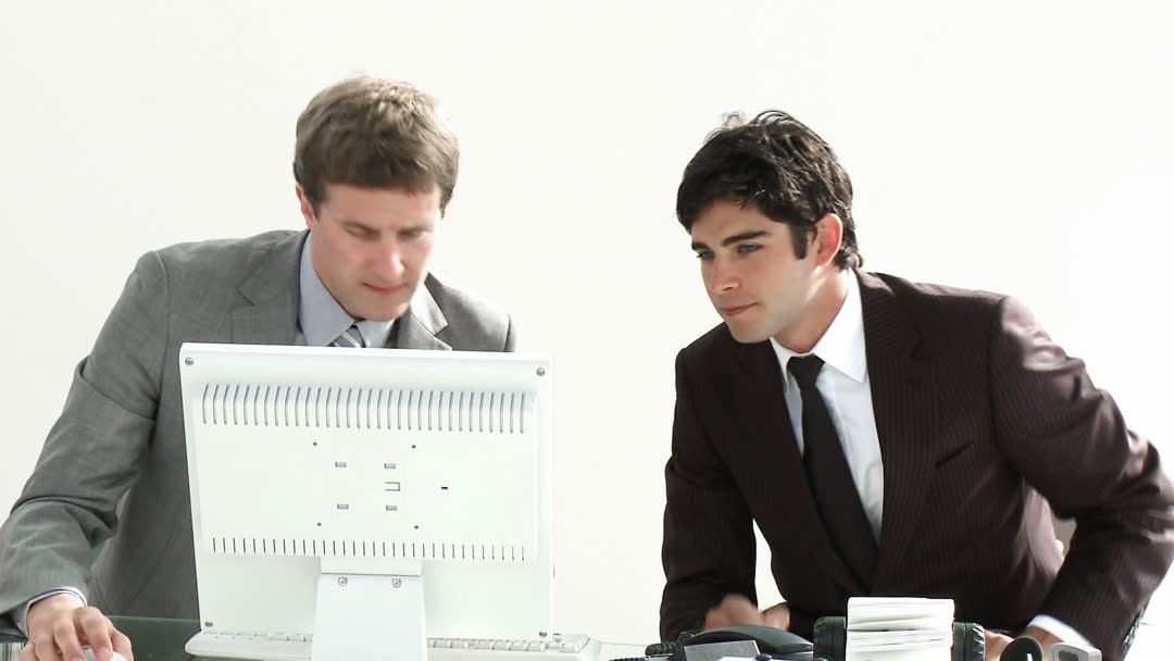 Two businessmen in professional attire working together at a computer. Ideal for illustrating themes of teamwork, corporate meetings, professional collaboration, or office technology usage. Useful for business blogs, teamwork awareness campaigns, and enterprise communication visuals.