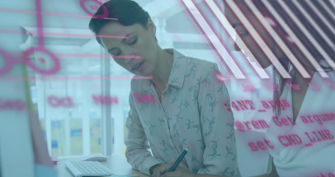Two women working together on computer-related tasks and data analysis at the office. Business and technology teams might find this useful for visualizing collaboration in data analysis projects.