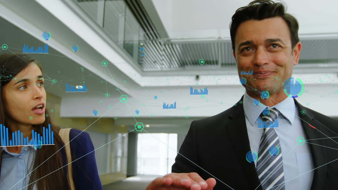 Business professionals walking and discussing with animated charts superimposed. Ideal for conveying themes of business communication, teamwork, and modern data handling. Suitable for content related to corporate settings, data analysis presentations, and office collaboration.