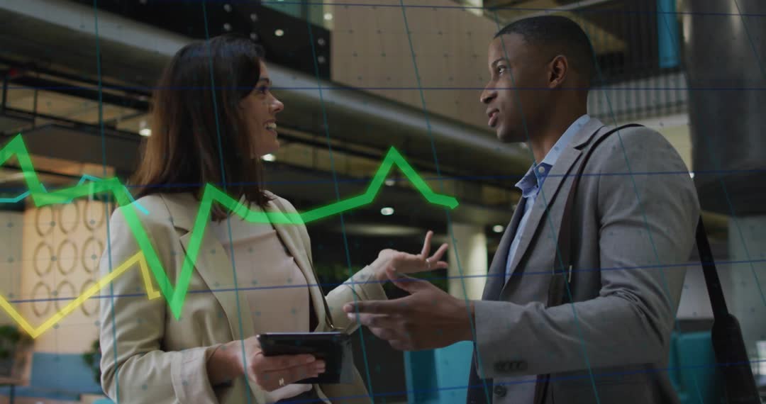 Dynamic video capturing two business professionals intently involved in a data analysis session using a tablet, while animated financial graphs visually represent their discussion. This clip is ideal for showcasing teamwork in a professional or corporate setting. It can be used in presentations about technological impacts on finance, or to illustrate modern business environments where data-driven decisions are made collaboratively.