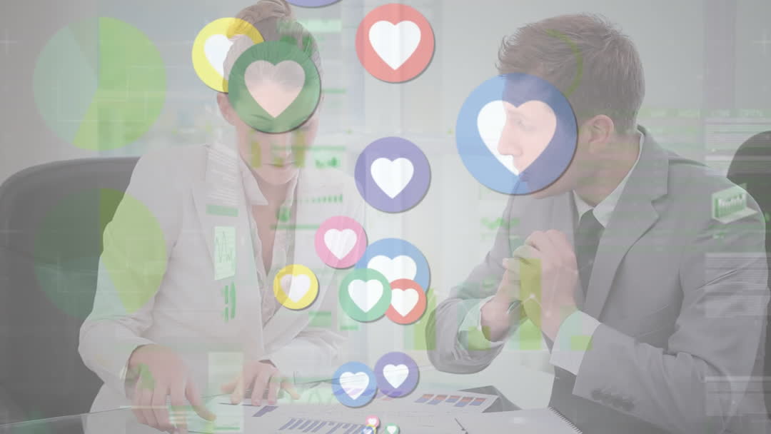 Two business professionals engage in analyzing social media performance data. Vibrant heart icons symbolize network engagement, seen overlaying the collaboration. Ideal for themes highlighting digital marketing strategies, online engagement analytics, and modern business communication tactics.