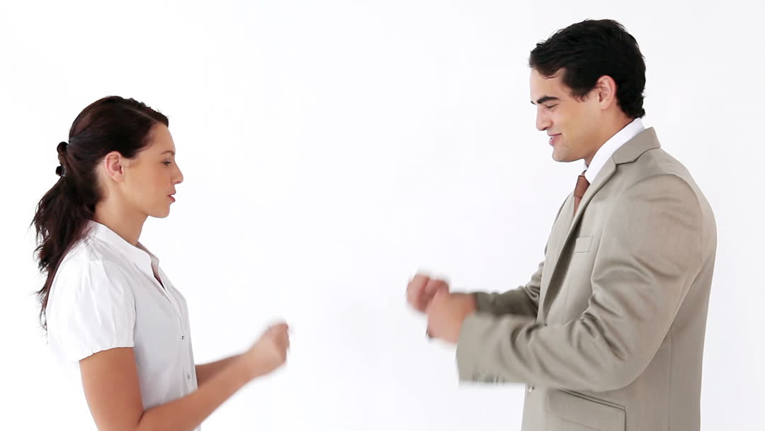 A Caucasian woman and a Hispanic man are seen smiling and interacting together, indicating leisure or team-building activity at the office. The plain white background suggests a neutral, modern workspace. This visual is useful for portraying a positive work culture, teamwork, and office environments committed to staff engagement and vigorous interaction.