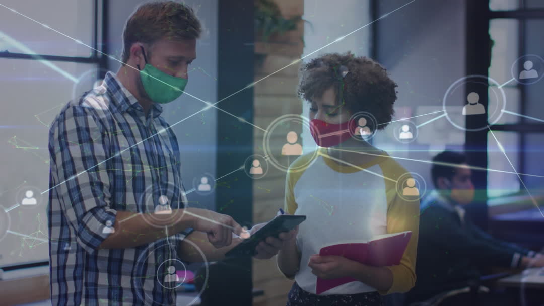 Business Colleagues Networking with Digital Overlay Wearing Masks Video