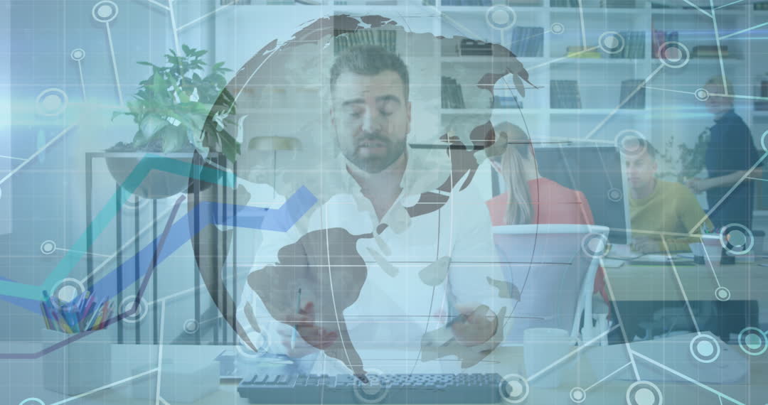 Businessman engaged in a video call prominently featured with overlay of animated graphs, globe, and connections symbolizing global communication and financial data. Such visuals can be used for materials related to international business communication, financial technology services, or corporate training highlighting remote work and digital networking solutions.