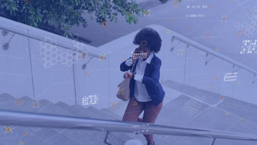 Video showing business commuter climbing urban staircase while talking on phone and checking watch, overlaid with hexagonal HUD graphics suggesting data flow and connectivity. Scene portraying urgency and multitasking during morning commute, with professional wearing blazer and carrying tote. Clip working well for corporate time management, mobile app promotion, fintech campaigns, productivity tips, commute safety messaging, business news B-roll, training modules, website hero banners, social media ads. Editing suggestions: using slow motion and subtle color grade, adding lower third text and logo reveal, pairing with upbeat techno or corporate music, creating seamless loop for background use. Duration flexibility allowing short 5-15 second cuts or longer 30-60 second branded sequences.