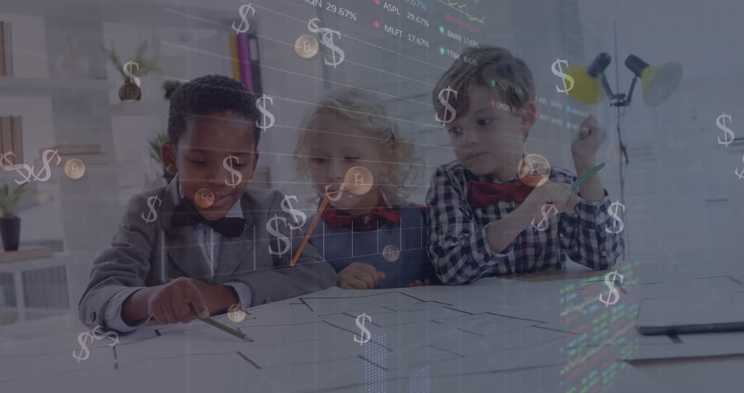 Group of young children wearing formal attire is learning about finance and economics, with digital graphics like profit charts and networking symbols superimposed. Ideal for illustrating educational programs in financial literacy, innovative teaching methods integrating technology, or campaigns aimed at simplifying complex economic concepts for a younger audience.