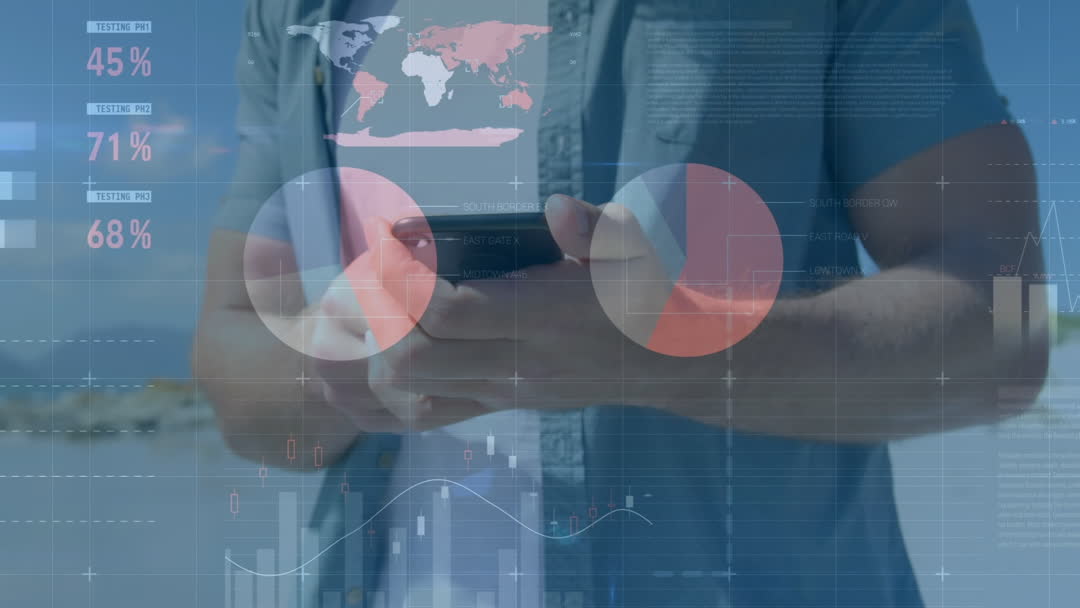 A businessman viewing financial data on a smartphone, with a digital overlay of statistics and graphs. Represents modern business analytics and the integration of technology in analyzing global data. Ideal for themes of data processing, virtual analytics in business contexts, or presentations on technological advancements.