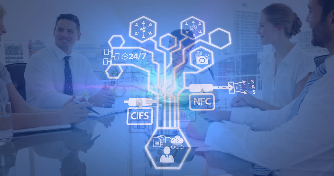 Digital interfaces featuring networking and collaboration icons hover over a diverse group of businesspeople in an office setting. Videos reflect themes of 24/7 connectivity, technology, and cutting-edge business processes, fostering collaboration and innovation. Ideal for illustrating high-tech business environments, promoting modern communication tools, or visualizing advanced digital solutions in corporate advertisements and presentations.